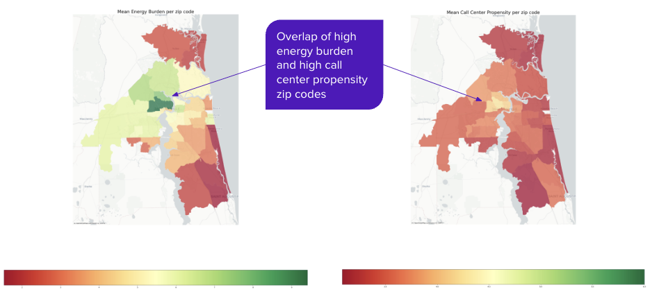 - Propensity Overlap: High energy burden households often overlap with zip codes showing the highest propensity for call center interactions, further emphasizing their need for direct support.