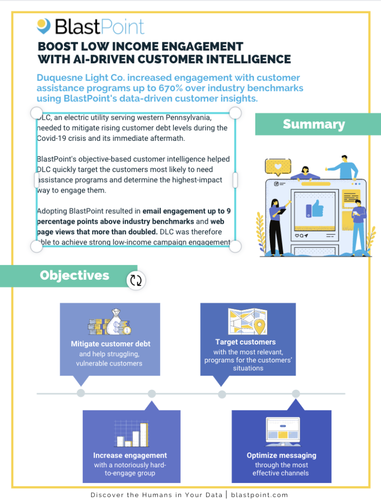 DLC, an electric provider serving southwestern PA, prioritizes helping customers – in fact, their motto is “we’re here to help.” To boost the visibility of customer assistance programs during the Covid crisis, DLC utilized BlastPoint’s customer intelligence to identify target customer segments for low-income email outreach campaigns.