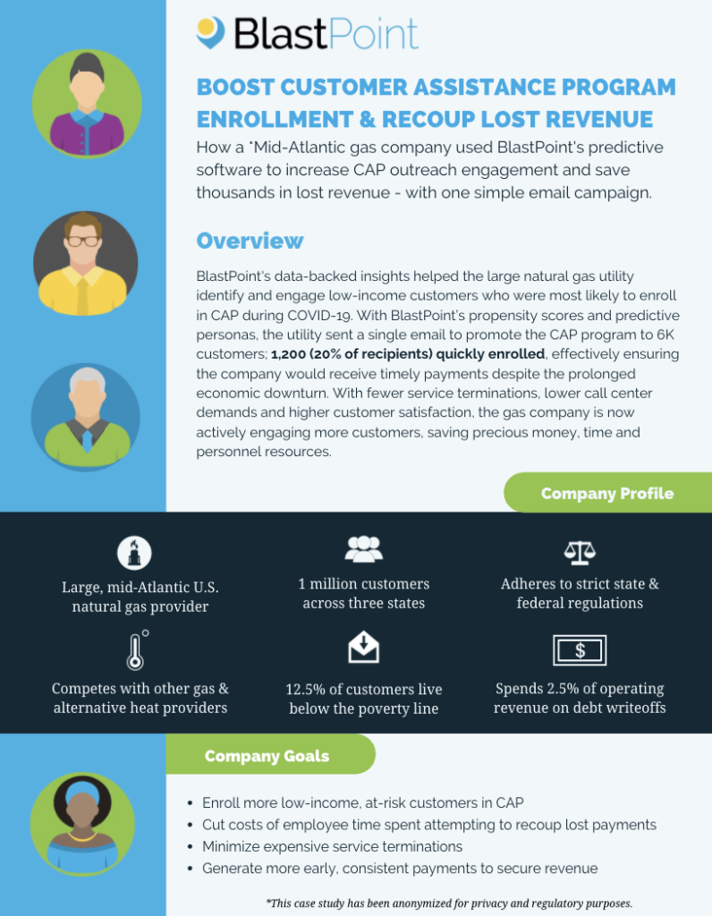 A 20% CAP sign up rate! A 47% payment-in-full response! Two new case studies available for download demonstrate how powerful a single outreach campaign can be – when you know who to target. We’re thrilled to share preliminary results from one of our energy partners who’s been applying BlastPoint’s predictive analytics software throughout COVID-19.