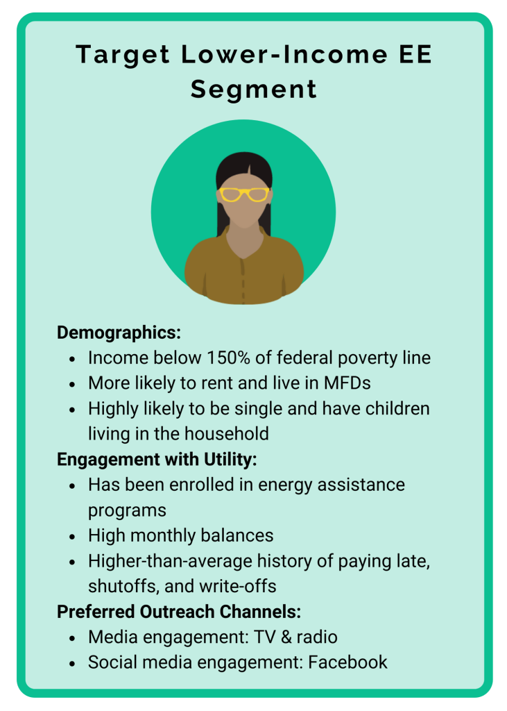 This segment of lower-income customers has engaged with the utility before, and is likely to do so again – especially if the energy efficiency program is pitched as affordable and as a way for them to lower their energy costs, rather than to benefit the environment. After all, they are currently paying a higher proportion of their income on energy costs than any other customer segment. They are even more likely to sign up for these programs, of course, if any equipment they need to get started is provided for free.