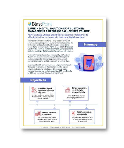 BlastPoint worked with the AEP CX Team to create AI-powered customer segments customized to the digital assistant launch. Specifically, BlastPoint’s proprietary technology found customers who were most likely to engage with AEPril across several operating companies. Based on these data-driven insights, the CX Team was able to: